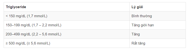 - Chỉ số Triglyceride rất cao: trên 500 mg/dL (trên 6 mmol/L).